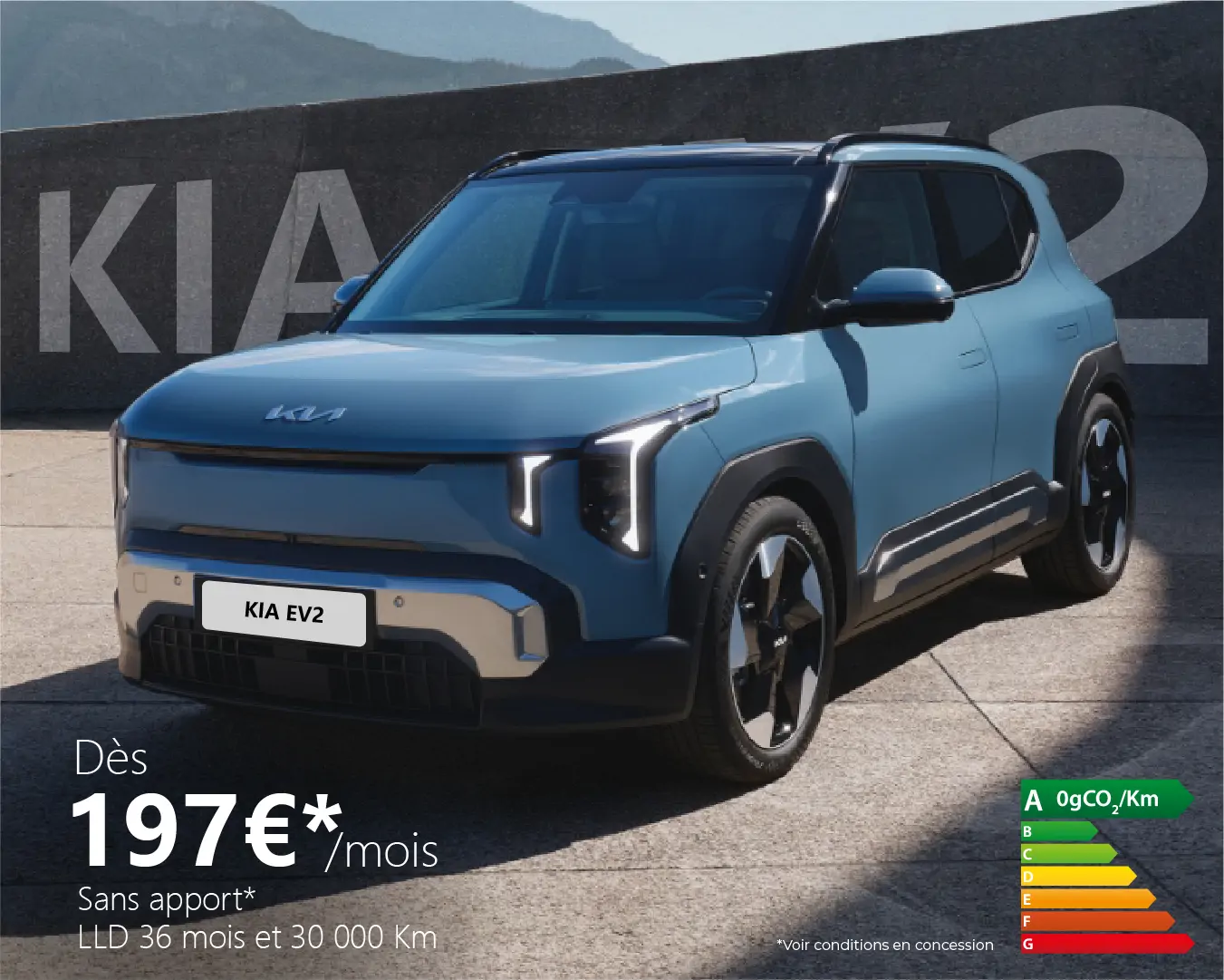 * Exemple de Location Longue Durée (LLD) sur 37 mois et 30 000 km pour le financement d'une KIA EV2 Air Autonomie Standard Batterie 42,2 kWh - 107,8 kW (147ch) 100% électrique (hors option). 1er loyer majoré de 5 600 € TTC ramené à 0 € TTC grâce à la prime CEE de 5 600 €*** puis 36 loyers mensuels de 197 € TTC. Exemple hors assurances et prestations facultatives. Modèle présenté : KIA EV2 Earth Autonomie Standard Batterie 42,2 kWh - 107,8 kW (147ch) 100% électrique avec option peinture métallisée, toit ouvrant non disponible à la commande, pack drivewise park. 1er loyer majoré de 5 600 € TTC ramené à 0 € TTC grâce à la prime CEE de 5 600 €*** puis 36 loyers mensuels de 267 € TTC. Exemple hors assurances et prestations facultatives.